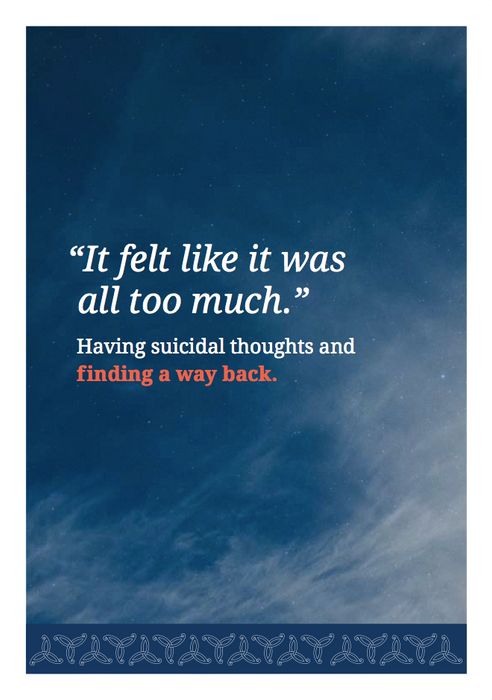 Having Suicidal Thoughts and Finding a Way Back is for people who are managing their own suicidal thoughts or feelings. It offers information about what support is available, advice from people who have lived through their own suicidal thoughts, and suggestions about recovery.