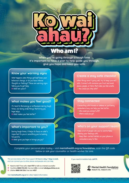 A series of A2-size posters that support the use of a personal plan when a rangatahi/young person is experiencing tough times or challenging thoughts.